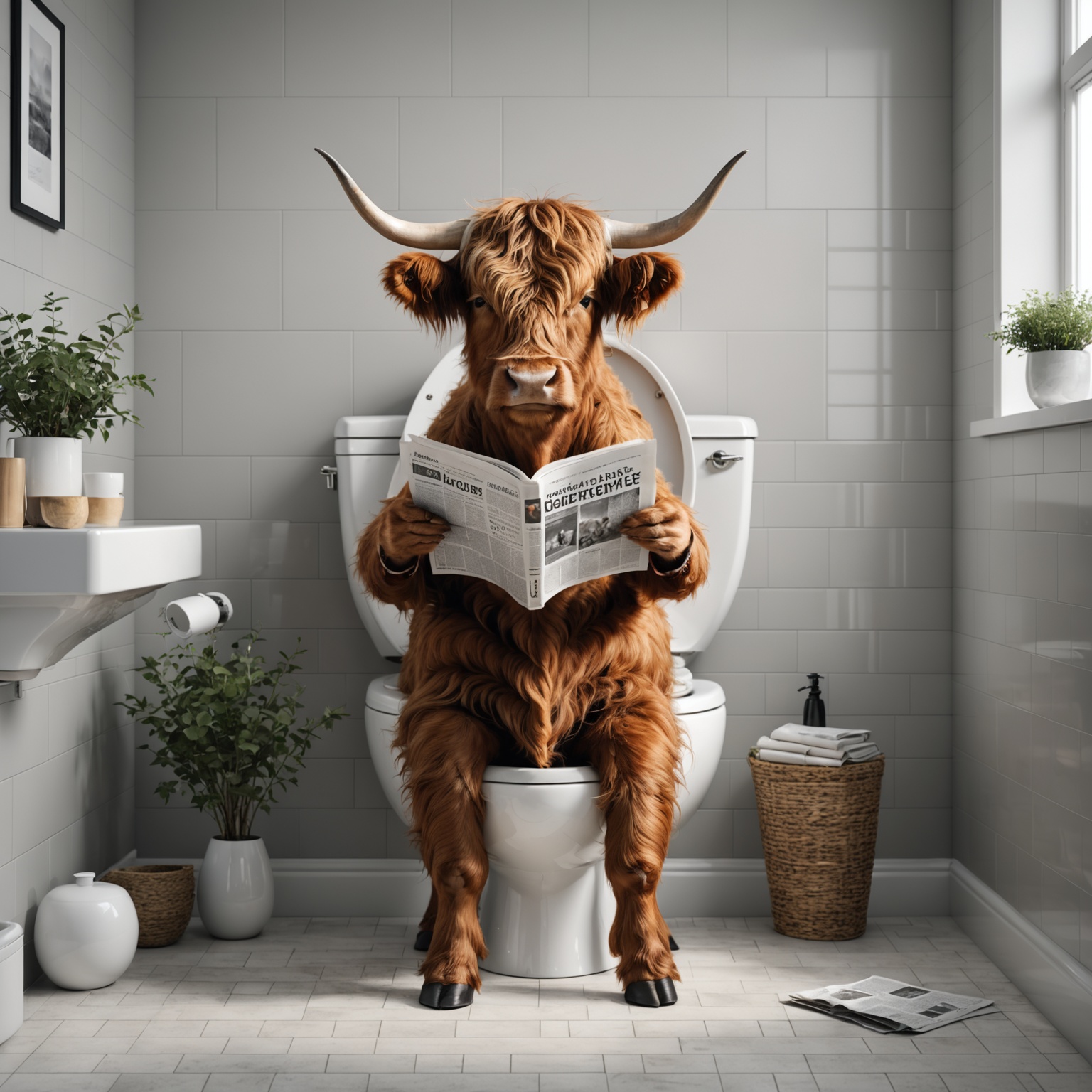 Ein humorvolles Bild zeigt eine Hochlandkuh, die auf einer Toilette sitzt und eine Zeitung liest. Die Kuh ist in der Mitte des Bildes positioniert, wobei ihre langen Hörner und ihr zotteliges Fell hervorstechen. Das Badezimmer ist sauber und modern eingerichtet. Weiße Fliesen und verschiedene Topfpflanzen tragen zur Ästhetik des Bildes bei.