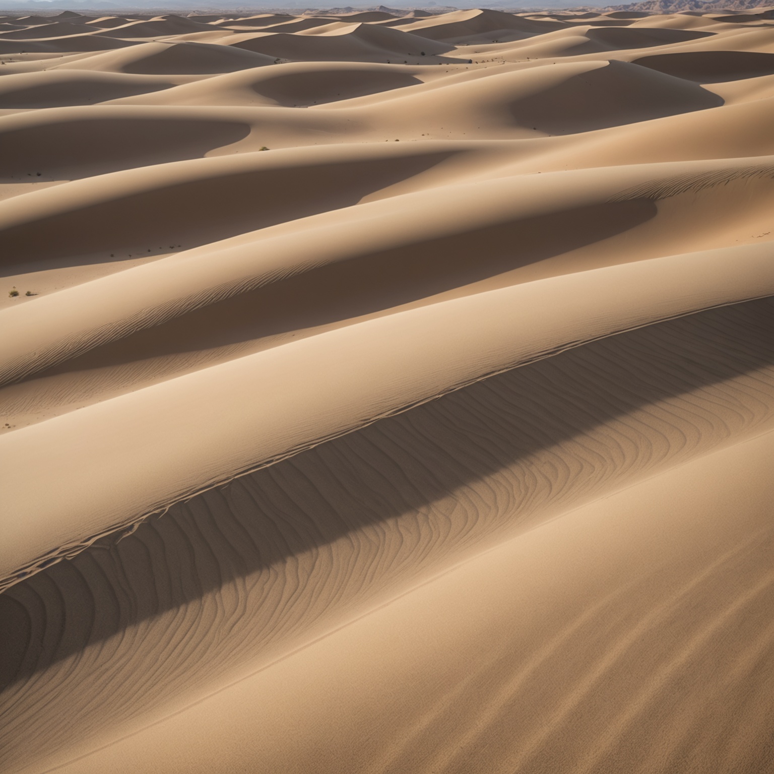 Primer plano de dunas de arena texturizadas en un paisaje desértico. Las suaves curvas y líneas de las dunas crean un patrón. La luz y la sombra realzan la profundidad y la textura de la arena.