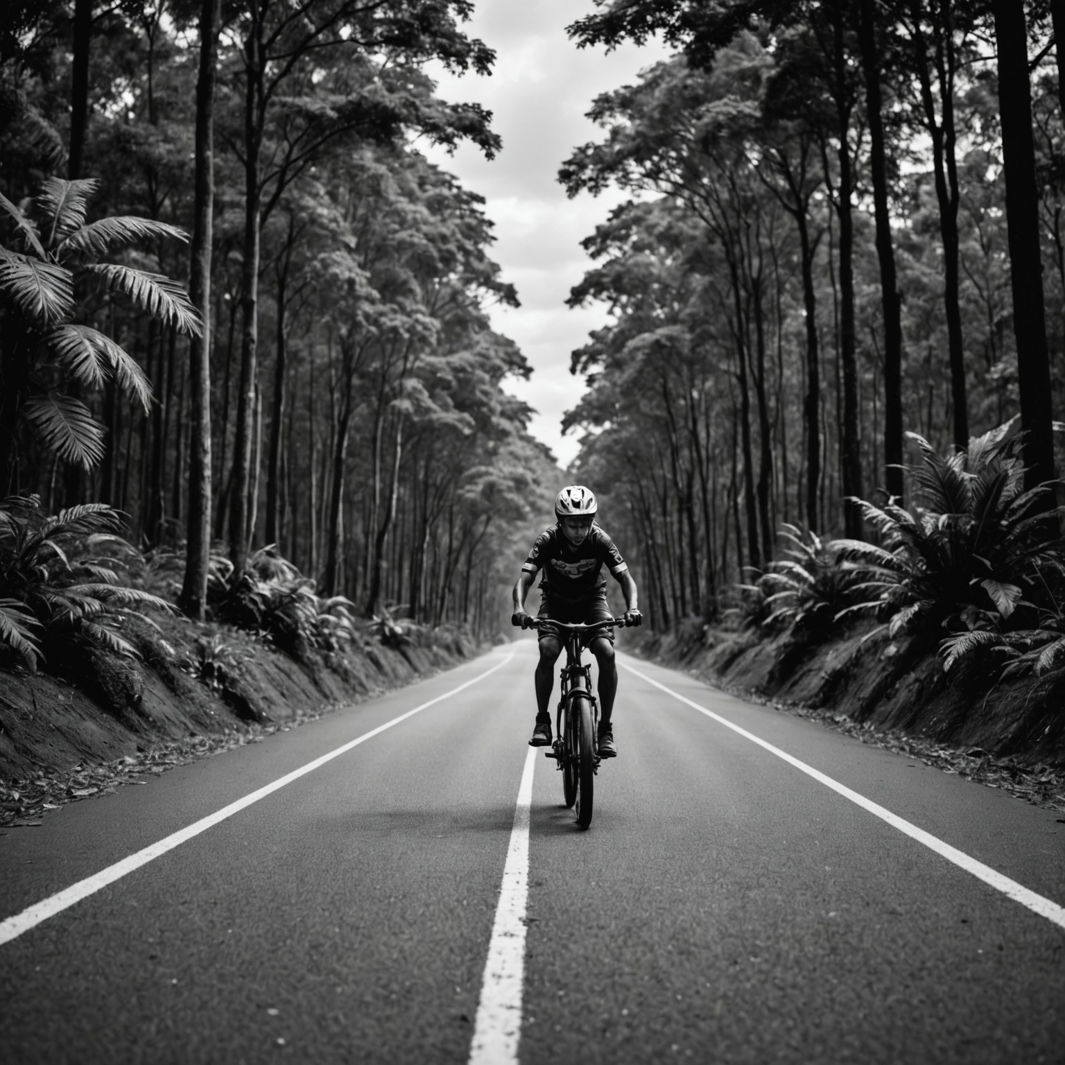 Un cycliste roule sur une route pavée à travers une forêt dense dans cette image saisissante en noir et blanc. La route s'étend tout droit, disparaissant au loin, bordée de grands arbres qui créent un effet de tunnel naturel. Le cycliste, qui porte un casque, est placé au centre de la route, ce qui donne une impression d'échelle et de solitude à la scène.