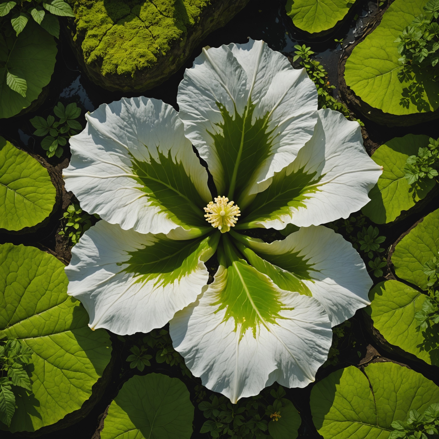 Vue aérienne en gros plan d'une grande fleur aux pétales blancs et verts. Le centre de la fleur est d'un jaune doux et elle est entourée d'un feuillage vert luxuriant, peut-être dans un étang ou un jardin d'eau. La disposition symétrique des pétales et des feuilles crée une composition visuellement attrayante.