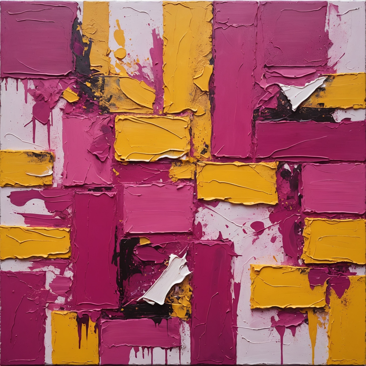 Peinture abstraite avec des couleurs rose, jaune, blanc et noir. La peinture est appliquée en couche épaisse, ce qui crée une texture. La composition est géométrique avec des formes rectangulaires.