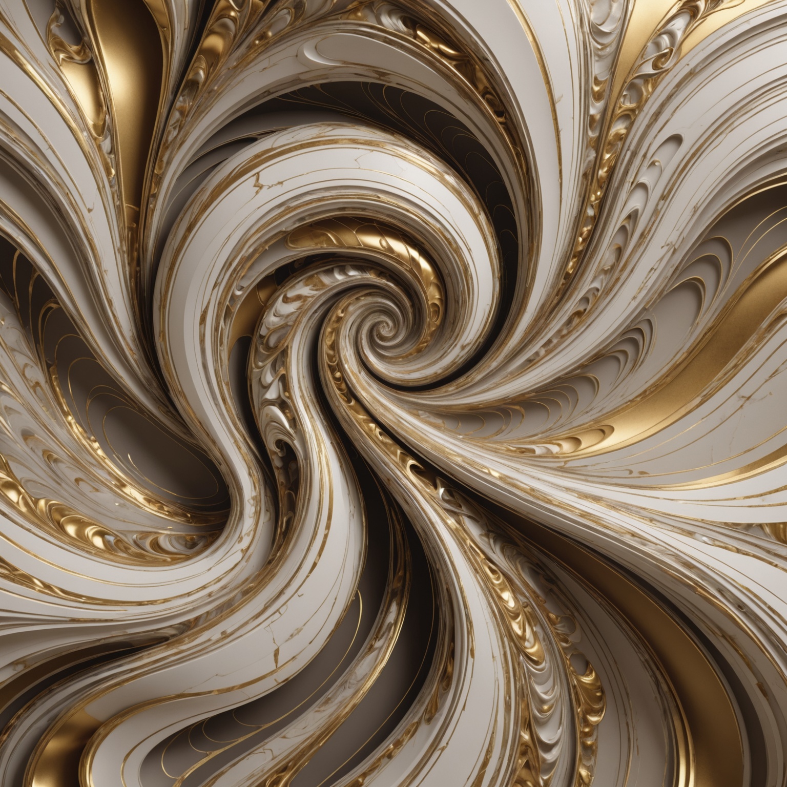 Cette œuvre d'art numérique abstraite présente des motifs tourbillonnants en blanc et en or, ressemblant à un tissu luxueux ou à un tourbillon. Les accents dorés ajoutent une touche d'opulence au motif fluide. La composition crée une impression de mouvement et de profondeur.