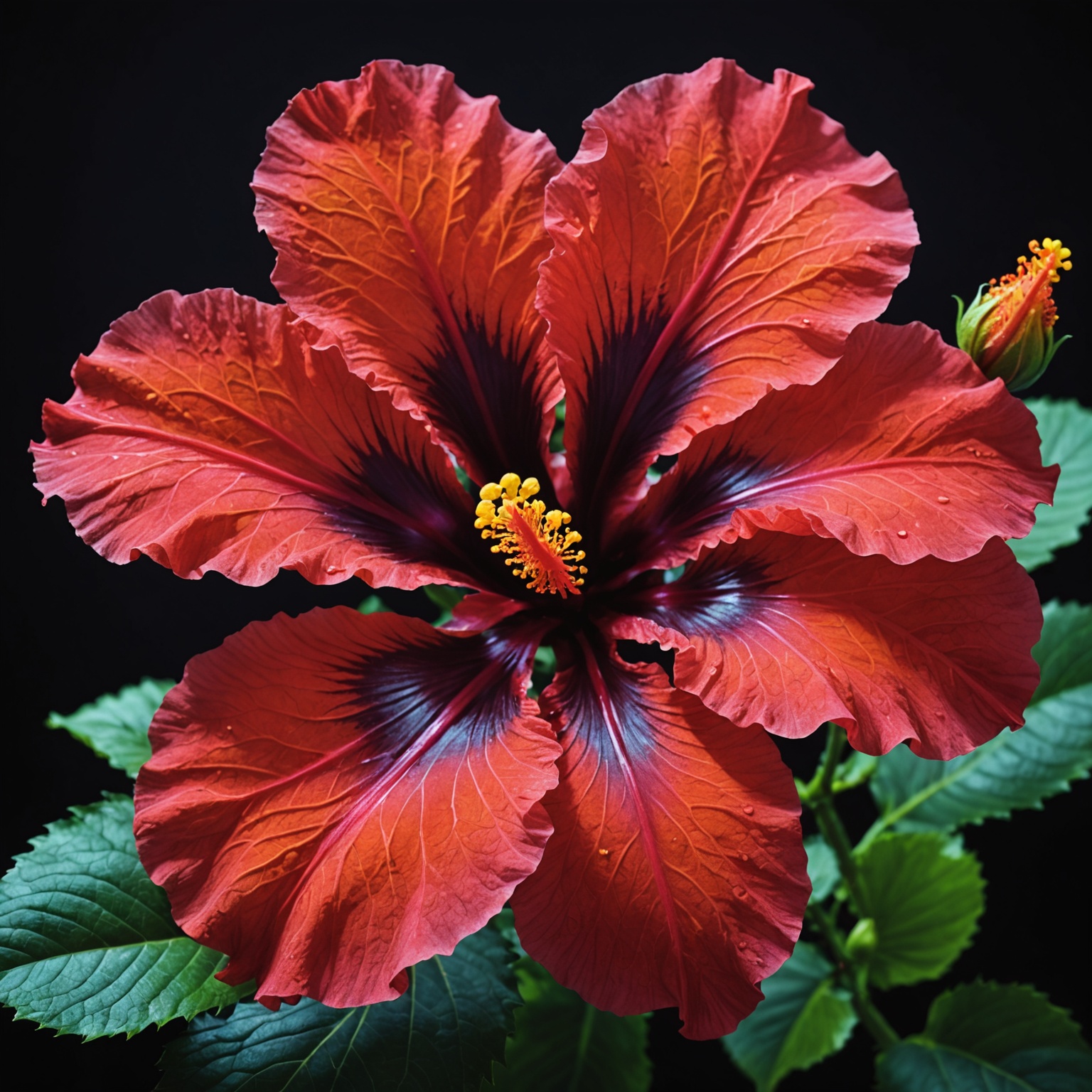 Primo piano di un fiore di ibisco dal colore rosso intenso e dal centro scuro, quasi nero, su uno sfondo nero. I petali del fiore hanno una consistenza arruffata e lo stame è di un giallo contrastante. Sullo sfondo sono visibili foglie verdi e un bocciolo chiuso.