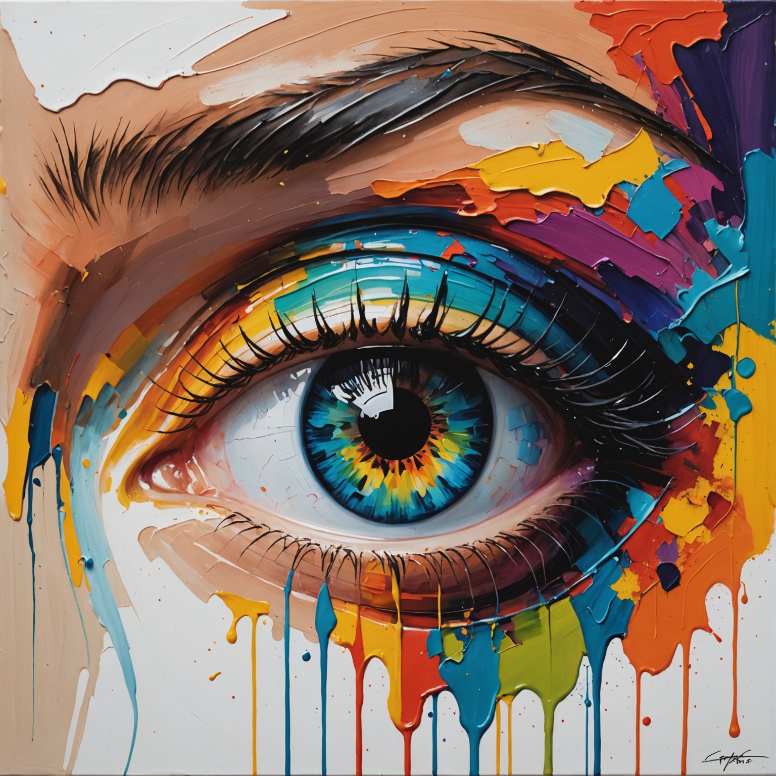 Primo piano di un occhio con schizzi di vernice colorata e vibrante. La vernice gocciola dall'occhio, creando un effetto dinamico e artistico. L'occhio stesso è molto dettagliato, con un'iride blu brillante e una pupilla scura.