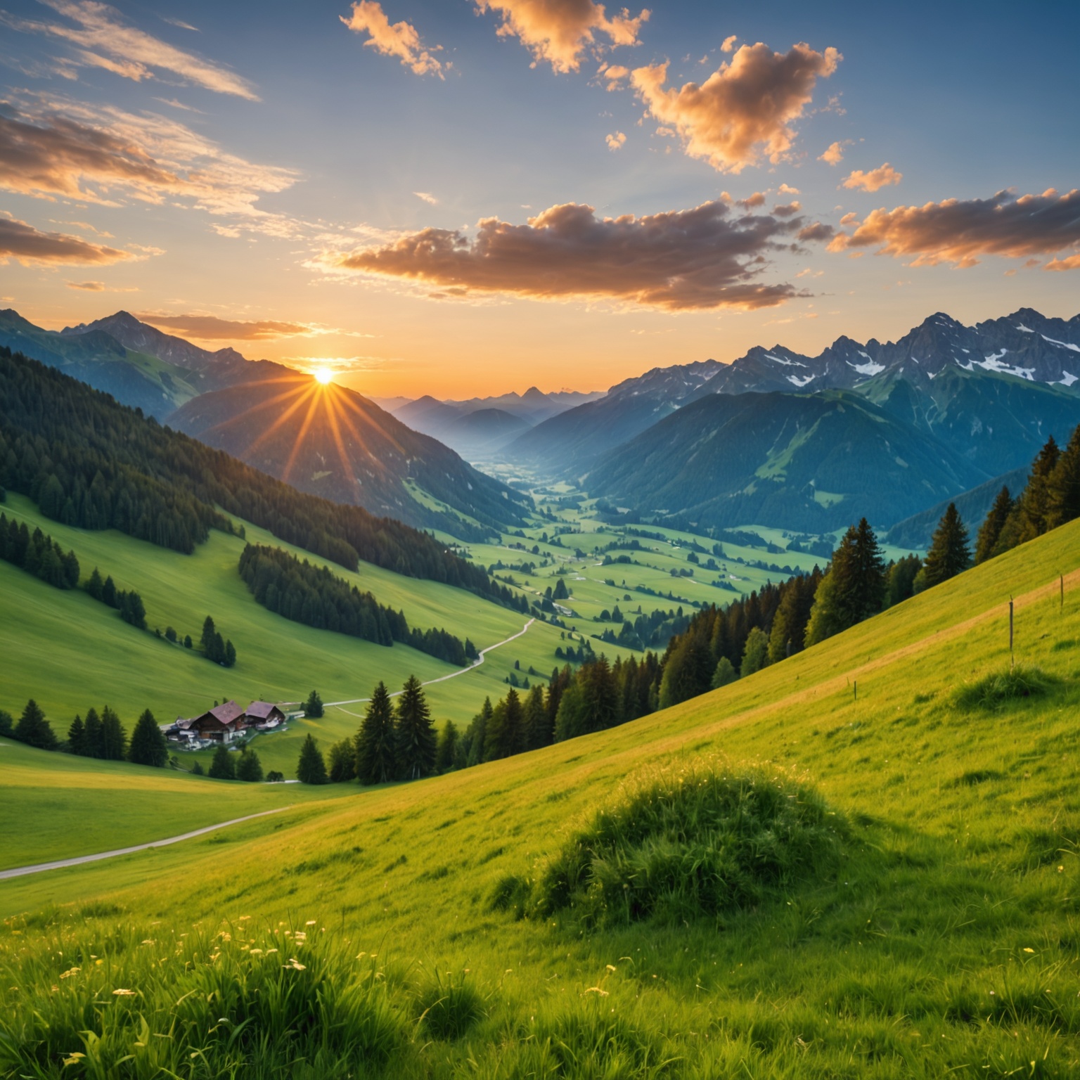 A picturesque valley is bathed in the golden light of sunset. The landscape is a patchwork of vibrant green fields and dark forests, leading to snow-capped mountains in the distance. A winding road connects a small cluster of houses nestled in the valley.
