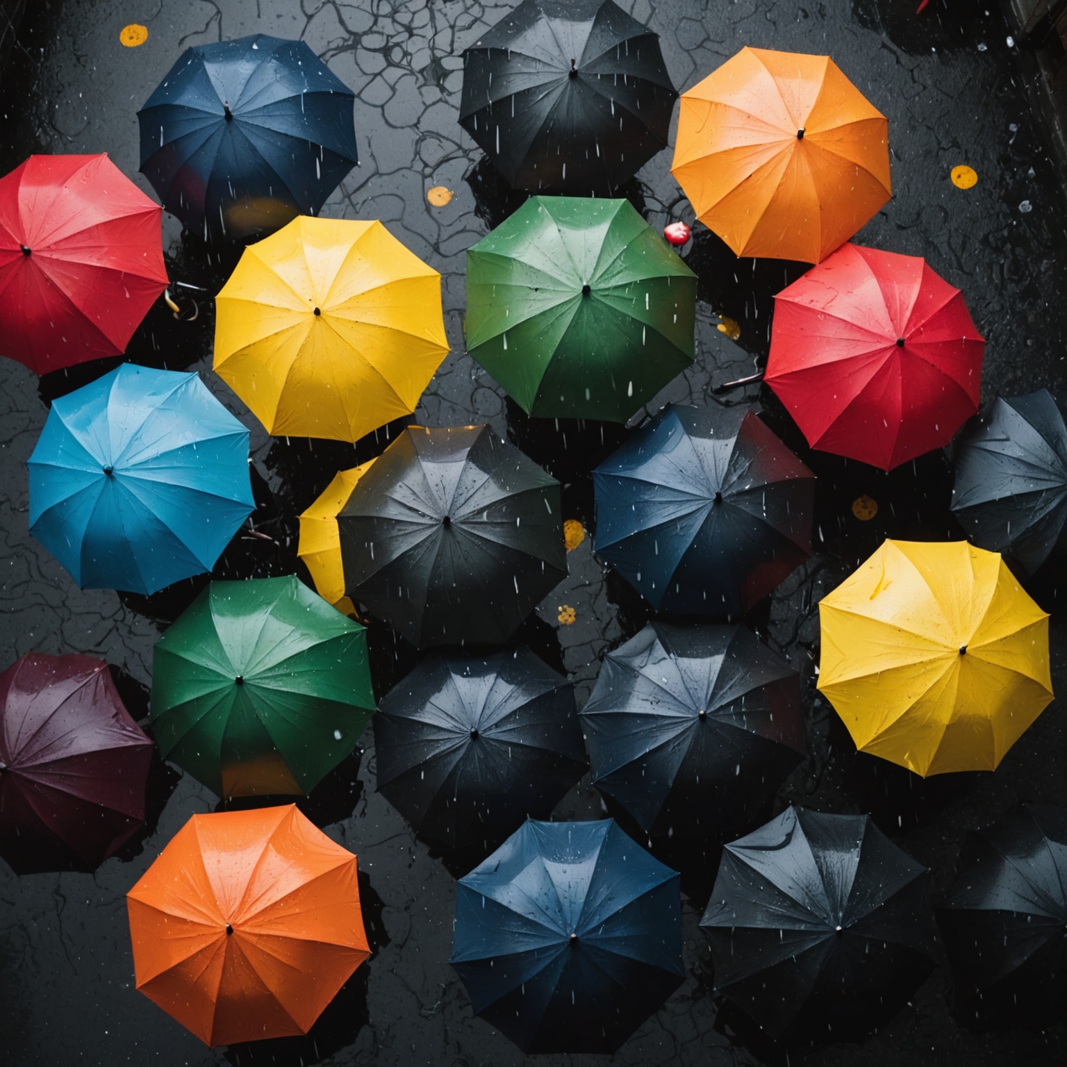 A top down view of a crowd of people holding colorful umbrellas on a dark rainy day. The vibrant colors of the umbrellas stand out against the dark background, creating a visually striking image.