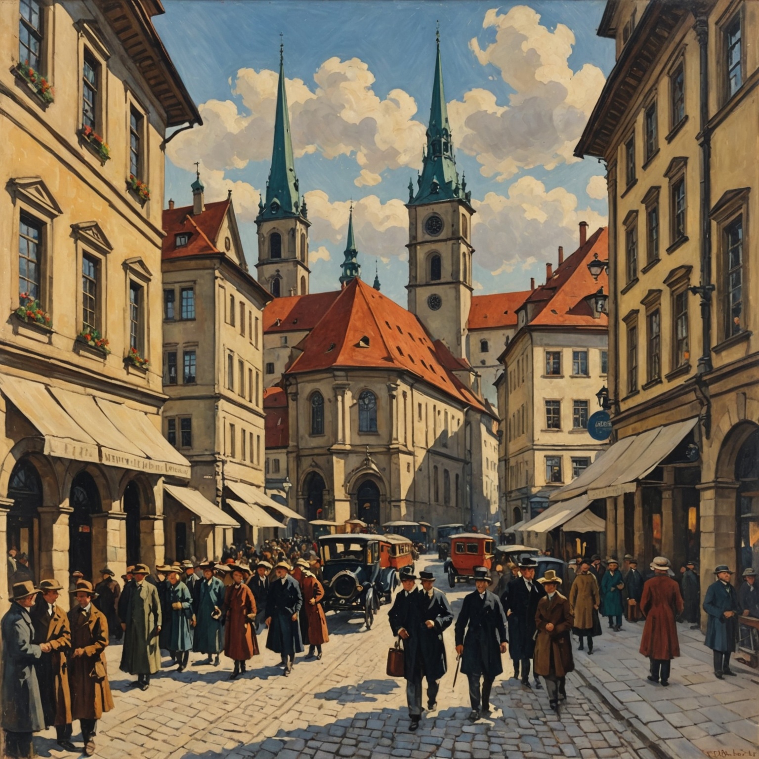 The image depicts a bustling street scene in a European city, reminiscent of the early 20th century. People dressed in period clothing stroll along cobblestone streets lined with shops and buildings with red-tiled roofs. In the background, a grand cathedral with twin spires rises above the cityscape, adding to the historical charm of the scene.
