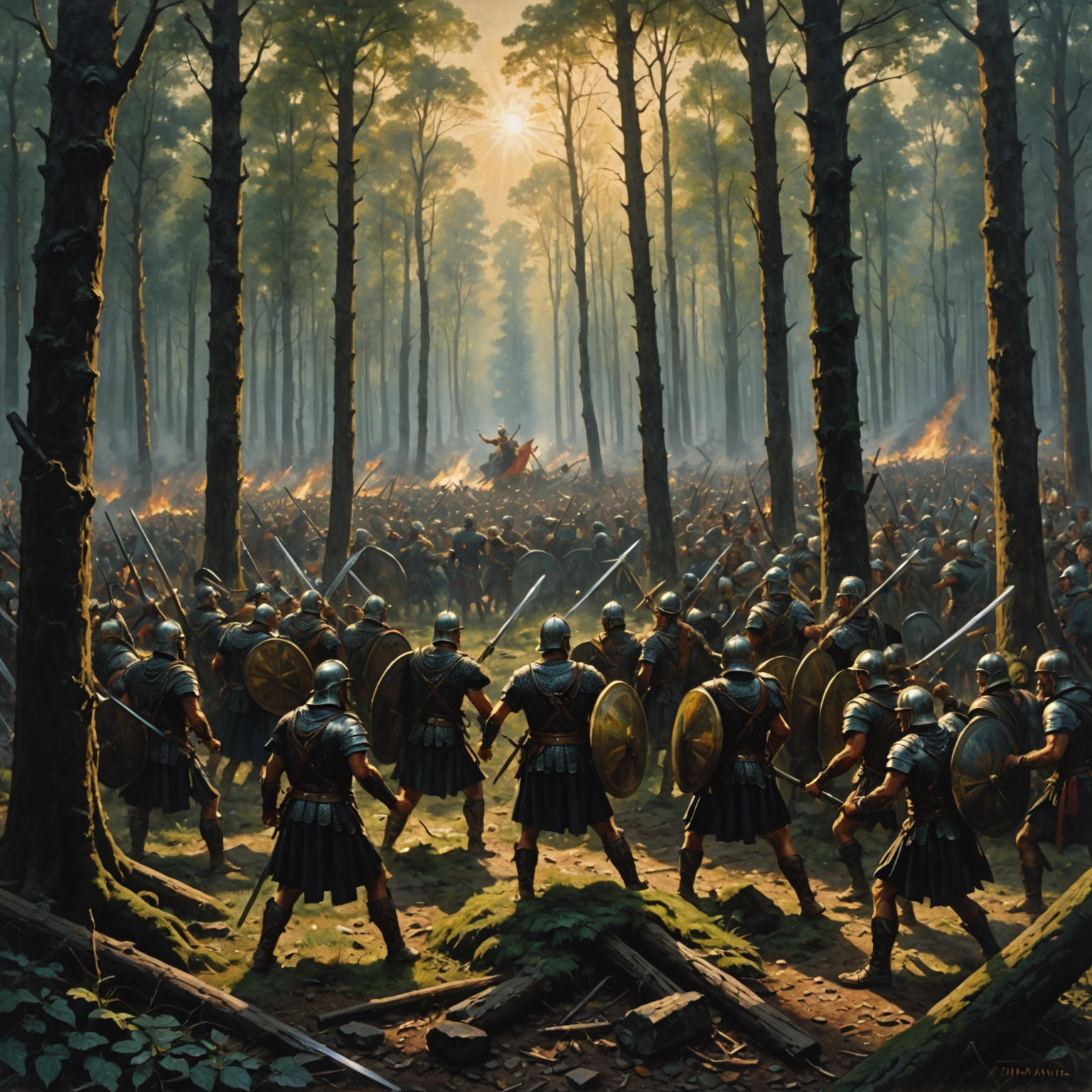 A dramatic battle scene unfolds in a sun-drenched forest, with two armies clashing amidst the trees. Soldiers with shields and spears engage in fierce combat, creating a sense of chaos and conflict. The sunlight filters through the trees, illuminating the scene and highlighting the intensity of the battle.