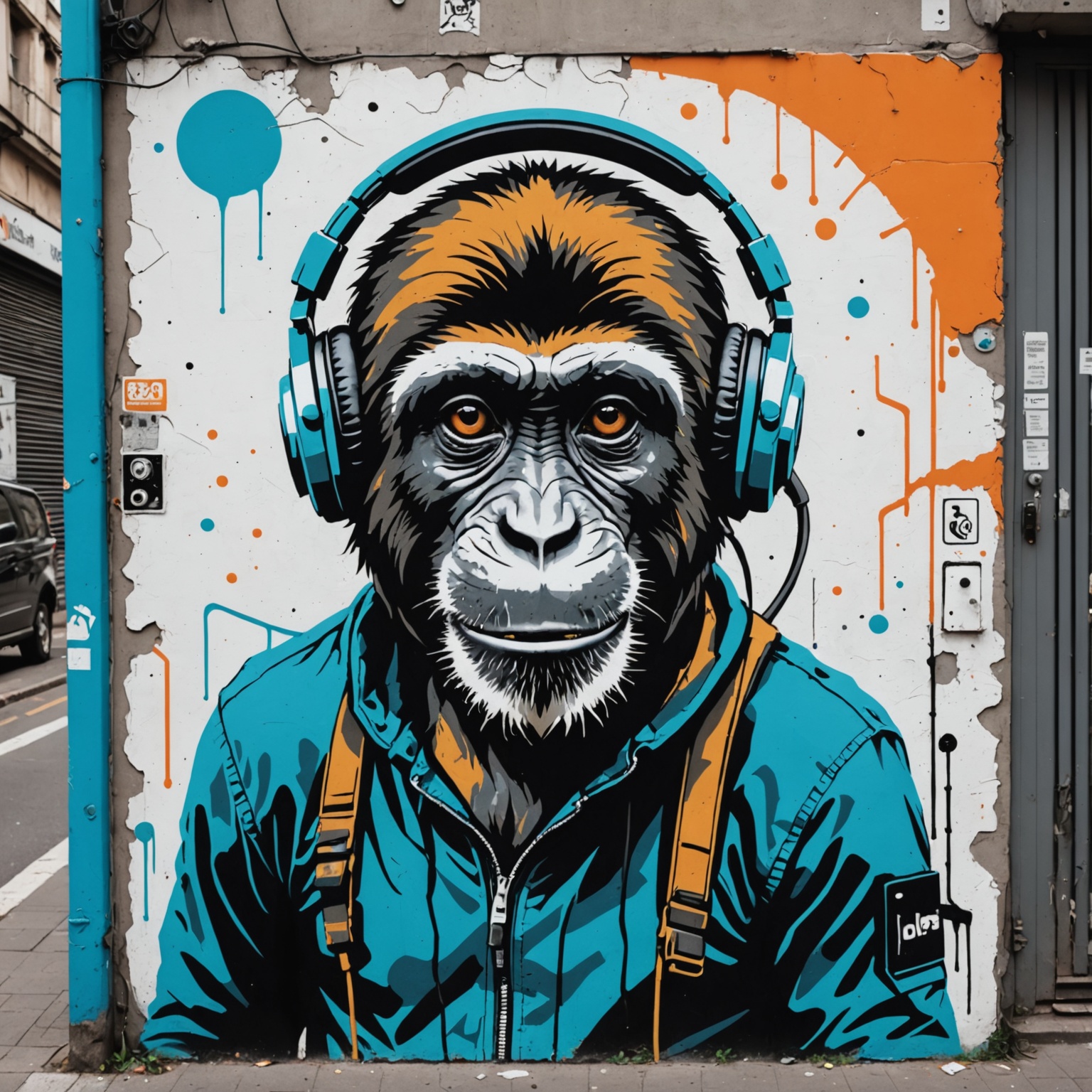 A striking graffiti art piece depicts a gorilla wearing headphones and a teal jacket. The artwork is set against a textured wall, adding to its urban aesthetic. The gorilla’s expression is calm and almost human-like.