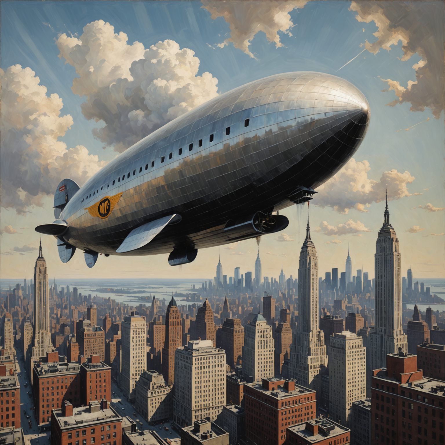 A silver zeppelin soars over a sprawling cityscape, possibly New York, under a partly cloudy sky. The zeppelin, marked with a gold and circular logo, navigates above a mix of high-rise and low-rise buildings. The scene evokes a sense of classic futurism or an alternate historical timeline.